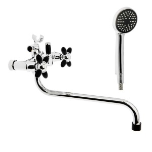 Смеситель имеет длинный поворотный излив и 2 вентиля для регулирования подачи воды. Режим «Душ» переключается поворотом рычага. Сантехника устанавливается на стену.