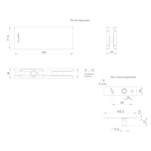 Верхнюю петлю с осью устанавливают на цельностеклянную дверь маятникового типа. Верхняя петля с осью используется совместно с нижней петлей-доводчик.