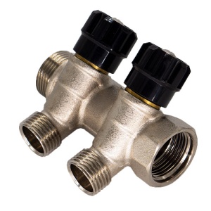 Коллектор 3/4" на 2 выхода диаметром 1/2" с вентилями СТМ применяется в трубопроводах систем горячего и холодного водоснабжения, многоконтурных установках водяного отопления (напольного, радиаторного с лучевой разводкой). В системах водоснабжения распределительный коллектор снижает взаимное влияние потребителей, обеспечивает равное входное давление. Применение коллекторов дает возможность отказаться от дополнительной арматуры – запорной, регулирующей, уменьшает число соединений, облегчает работу проектировщиков, монтажников, наладчиков инженерных систем. Вентиль на каждом выходе предназначен для регулирования расхода рабочей среды. Корпус коллекторов производится из высококачественной горячепрессованной латуни. На ручках вентиля имеется возможность указания потока "потребителя" - ванна, душ, раковина и т.д