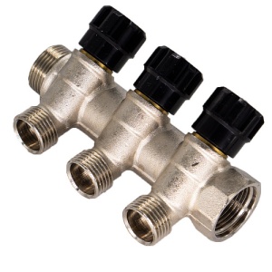 Коллектор 3/4" на 3 выхода диаметром 1/2" с вентилями СТМ применяется в трубопроводах систем горячего и холодного водоснабжения, многоконтурных установках водяного отопления (напольного, радиаторного с лучевой разводкой). В системах водоснабжения распределительный коллектор снижает взаимное влияние потребителей, обеспечивает равное входное давление. Применение коллекторов дает возможность отказаться от дополнительной арматуры – запорной, регулирующей, уменьшает число соединений, облегчает работу проектировщиков, монтажников, наладчиков инженерных систем. Вентиль на каждом выходе предназначен для регулирования расхода рабочей среды. Корпус коллекторов производится из высококачественной горячепрессованной латуни. На ручках вентиля имеется возможность указания потока "потребителя" - ванна, душ, раковина и т.д.