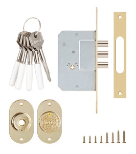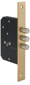 Врезной замок 3 ригеля с крестовым (5 пинов) цилиндровым механизмом. Расстояние от планки до центра цилиндра 45мм. 5 ключей.