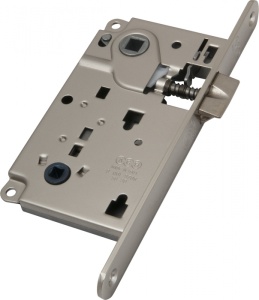 Patent Замок межкомнатный WC сантехнический. 1защёлка в вверху. Ширина планки 18мм. Расстояние от планки до центра цилиндра 50мм. Межосевое расстояние 90мм. Цвет: никель