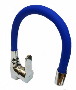 Смеситель для мойки монокомандный артикул Т-01 с синим силиконовым изливом. Монтаж на одно отверстие вертикальный. Крепление на гайку. Картридж 40 мм. Гибкая подводка в комплекте. Смеситель упакован в индивидуальную брендированную коробку. Групповая упаковка 10 шт