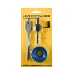 Набор для установки защелок-кнобов. В комплекте - сверло перовое с хвостовиком d=22мм, кольцевая пила d=54мм, направляющее сверло для кольцевой пилы d=6мм. Отличается качественной заточкой и долговечностью службы.