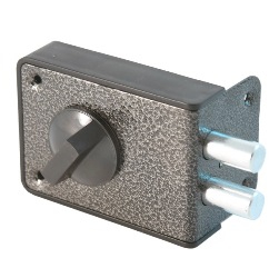 Замок накладной цилиндровый с вертушкой. Предназначен для установки на деревянные двери. Засов из двух цилиндрических ригелей диаметром 14 мм, с максимальным вылетом 30 мм. Удаление ключевого отверстия - 60 мм. Габариты замка - 100х75х25 мм. Комплектация - 5 ключей, запорная планка, накладка. Механизм замка под англ.ключ, идет совместно с корпусом. Закрывание и открывание замка изнутри производится вертушкой, снаружи ключом.