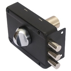 Замок накладной цилиндровый с вертушкой. Предназначен для установки на деревянные двери. Засов из трех цилиндрических ригелей диаметром 14 мм, с максимальным вылетом 24 мм. Удаление ключевого отверстия - 63 мм. Габариты замка - 123х87х31 мм. Комплектация - 6 ключей, запорная планка, накладка. Механизм замка под англ.ключ, идет совместно с корпусом. Закрывание и открывание замка изнутри производится вертушкой, снаружи ключом.