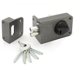 Замок накладной цилиндровый с вертушкой. Предназначен для установки на деревянные двери. Засов из двух цилиндрических ригелей диаметром 11 мм, с максимальным вылетом 25 мм. Удаление ключевого отверстия - 60 мм. Габариты замка - 100х64х22,5 мм. Комплектация - 5 ключей, запорная планка, накладка. Закрывание и открывание замка изнутри производится ручкой, снаружи ключом. Есть функция автоматического запирания.