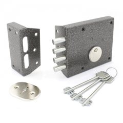 Замок накладной сувальдный для металлических дверей. Засов из четырех цилиндрических ригелей диаметром 11 мм, с максимальным вылетом 26 мм. Удаление ключевого отверстия - 72,5 мм. Габариты замка - 130х110х19 мм. Комплектация - 4 ключа, запорная планка, накладка.