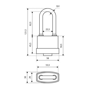 Материал Чугун Запирание Автоматическое Закаленная дужка Да Количество ключей 6 Диаметр дужки 8.5 мм Штук в минибоксе 6 Назначение всепогодные Общеe Код товара 7831 Производитель Аллюр Страна производства КИТАЙ Цвет Черный Гарантия 3 года Габариты и веc Вес (брутто) 0.41 Упакoвка Индивидуальная упаковка Блистер Штук в коробке 48 Транспортная упаковка 1 Ширина 0.115 Длина 0.185 Высота 0.037 Особеннoсти Класс секретности 1 класс Тип механизма секретности Цилиндровый, английский ключ Тип замка Замки навесные Замок навесной цилиндровый всепогодный с классической дужкой. Используются на дверях, оборудованных проушинами. Материал корпуса - чугун в пластиковом кожухе. Размер корпуса 58,2х45,7х29,1 мм. Стальная закаленная дужка диаметром 8,4 мм., покрыта полимерной краской. Проём дужки по высоте: 62,5 мм., проём дужки по ширине: 25,4 мм. Замок запирается автоматически при нажатии на дужку без использования ключа. Замок оснащен стальным цилиндровым механизмом секрета с 6-ю ключами.