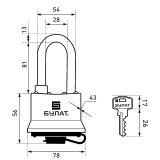 Материал Сталь Запирание Автоматическое Закаленная дужка Да Количество ключей 5 Диаметр дужки 13 мм Штук в минибоксе 6 Назначение всепогодные Общеe Код товара 13460 Производитель БУЛАТ Страна производства КИТАЙ Гарантия 5 лет Габариты и веc Вес (брутто) 0.743 Упакoвка Индивидуальная упаковка Блистер Штук в коробке 24 Ширина 0.13 Длина 0.208 Высота 0.045 Особеннoсти Класс секретности 3 класс Тип механизма секретности Цилиндровый, английский ключ Тип замка Замки навесные Замок навесной «БУЛАТ» предназначен для запирания, распределительных щитов, почтовых ящиков, гаражей, складов, подвалов и прочих помещений. Пластиковый кожух защищает замок от внешнего воздействия окружающей среды. Замок обладает длительным сроком эксплуатации. Гарантийный срок 5 лет с момента продажи через розничную сеть. Размер корпуса: 78х56х43 мм Диаметр дужки: 13 мм Проем дужки по высоте: 81 мм Проем дужки по ширине: 28 мм
