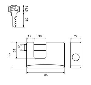 Замок навесной цилиндровый общего применения с прямой дужкой. Используются на дверях, оборудованных проушинами. Всепогодная серия с дополнительной защитой дужки от взлома. Материал корпуса - чугун в пластиковом кожухе. Размер корпуса 85х52х22 мм. Стальная закаленная дужка диаметром 12 мм., с гальваническим покрытием. Проём дужки по высоте: 15 мм., проём дужки по ширине: 30 мм. Замок запирается автоматически при нажатии на дужку без использования ключа. Замок оснащен латунным цилиндровым механизмом секрета с 5 ключами.