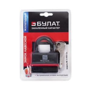 Материал Чугун Запирание Механическое Закаленная дужка Да Количество ключей 5 Диаметр дужки 8 мм Штук в минибоксе 6 Назначение всепогодные Общеe Код товара 13983 Производитель БУЛАТ Страна производства КИТАЙ Гарантия 5 лет Габариты и веc Вес (брутто) 0.29 Упакoвка Индивидуальная упаковка Блистер Штук в коробке 36 Ширина 0.112 Длина 0.192 Высота 0.04 Особеннoсти Класс секретности 2 класс Тип механизма секретности Дисковый Тип замка Замки навесные Замок навесной «БУЛАТ» предназначен для запирания, распределительных щитов, почтовых ящиков, гаражей, складов, подвалов и прочих помещений. Материал корпуса- высокопрочный чугун. Пластиковый кожух защищает замок от внешнего воздействия окружающей среды. Замок обладает длительным сроком эксплуатации. Гарантийный срок 5 лет с момента продажи через розничную сеть. Размеры корпуса: 53x36x23 мм Диаметр дужки: 8 мм Проем дужки по высоте: 27 мм Проем дужки по ширине: 24 мм