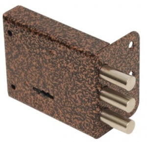 Замок накладной сувальдный. Предназначен для установки на деревянные двери. Засов из трех цилиндрических ригелей диаметром 12 мм, с максимальным вылетом 26 мм. Удаление ключевого отверстия - 55 мм. Количество полуоборотов ключа - 2. Габариты замка - 98х78х21 мм. Комплектация - 3 ключа, торцевая планка. Замок имеет защиту от отмычек, от высверливания и от вскрытия методом проворота.