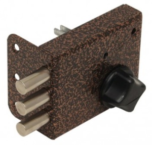 Замок накладной сувальдный с вертушкой. Предназначен для установки на деревянные двери. Засов из трех цилиндрических ригелей диаметром 12 мм, с максимальным вылетом 26 мм. Удаление ключевого отверстия - 55 мм. Количество полуоборотов ключа - 2. Габариты замка - 98х78х21 мм. Комплектация - 5 ключей, торцевая планка. Замок имеет защиту от отмычек, от высверливания и от вскрытия методом проворота. Закрывание и открывание изнутри производится вертушкой, снаружи ключом. Комплектный ключ с одной бородкой.