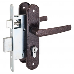 Замок врезной с ручками, цилиндровый. Предназначен для установки в деревянные двери толщиной 40-50мм, правого и левого открывания. Стальной оцинкованный корпус. Прямоугольный ригель из цинкового сплава, вылет 22мм. Межосевое расстояние 55мм. Удаление ключевого отверстия 55мм. Габаритный размер 85х130 мм. Ручки - алюминиевый сплав, покрытие - краска, без пружины, крепление - стяжками. Комплектуется цилиндровым механизмом 70мм с 4 ключами.