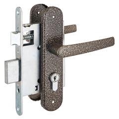 Замок врезной с ручками, цилиндровый. Предназначен для установки в деревянные двери толщиной 40-50мм, правого и левого открывания. Стальной оцинкованный корпус. Прямоугольный ригель из цинкового сплава, вылет 22мм. Межосевое расстояние 55мм. Удаление ключевого отверстия 55мм. Габаритный размер 85х130 мм. Ручки - алюминиевый сплав, покрытие - краска, без пружины, крепление - стяжками. Комплектуется цилиндровым механизмом 70мм с 4 ключами.