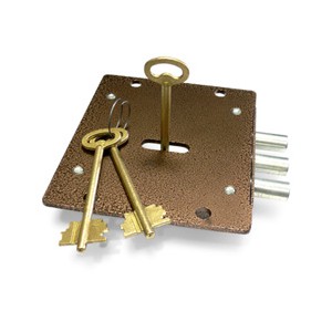 Комплектация: накладка оцинкованная, запорная плашка, комплект ключей - латунь (3 шт.), паспорт.